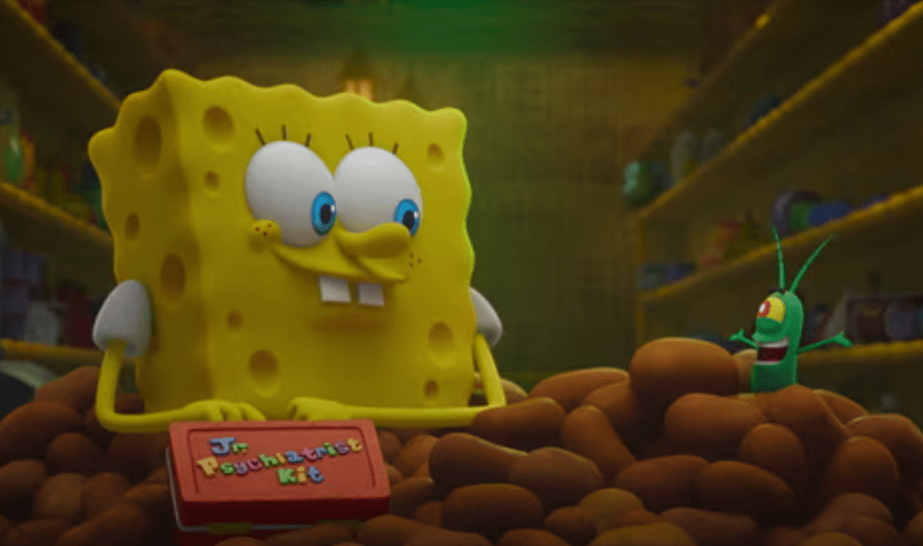 When it comes to the animation for this project, they decided to go the computer animated route a la the last two SpongeBob features (the aforementioned Sandy spin off and Sponge on the Run) and it looks decent for the most part. I’ll admit was not sure how to feel about it at first, as there are aspects of it that do a little to be desired for this kind of movie with some stiff character movements the graphics not looking as great at times with it kind of resembling a video game sometimes. That being said, one gets used to it and there are some strong visual elements that manage to work. The main characters are translated quite well in this style, with some solid expression work done that makes the facial features shine. Plus the scenes of physical comedy and gags are nicely done with the right amount of energy and are fun to watch unfold. When the visuals truly shine are during the flashback sequences where we get some really cool uses of different styles with a flashback scene involving some 1930s rubberhose animation being a highlight as is a musical sequence that felt very psychedelic fever dream in its execution. I also found the use of live action in certain parts to be pretty clever as well.