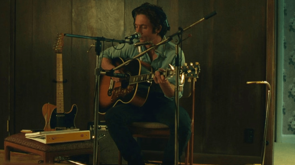 If the music biopic has become known for being an excuse to play all of the greatest hits like the audience is at some sort of concert, then it is amusing to the extent Deliver Me From Nowhere aggressively tries to avoid becoming that. This is a film where Bruce Springsteen hears his hit song, Hungry Heart, playing on the radio and immediately turns it off, which is a perfect indicator of the kind of biopic we’re dealing with here. Instead, Scott Cooper is trying to go for a more introspective examination of this moment in Bruce’s life, with him making an artistically fulfilling, but not quite commercial album that bucks a lot of conventional trends. For the most part, this approach worked for me as I found Cooper’s way of letting the audience breathe in moments with the characters to be compelling with plenty of interesting insight into why Bruce is the man he is. There are plenty of moments of contemplation that also serve to get us into Bruce’s mindset when making his music and while this is not handled in some new way, I do like how this film focuses on that more so than other biopics as well as the technical aspects of making this sort of experimental album, as I feel the film does a good job informing why Nebraska was as risky as it was and why there was much concern in the industry circle for why Bruce was doing this. Also dives into the idea of an artist wanting to use their art to reflect themselves and find peace with whatever struggles they have/are facing and here is where I think the movie is at its most compelling.